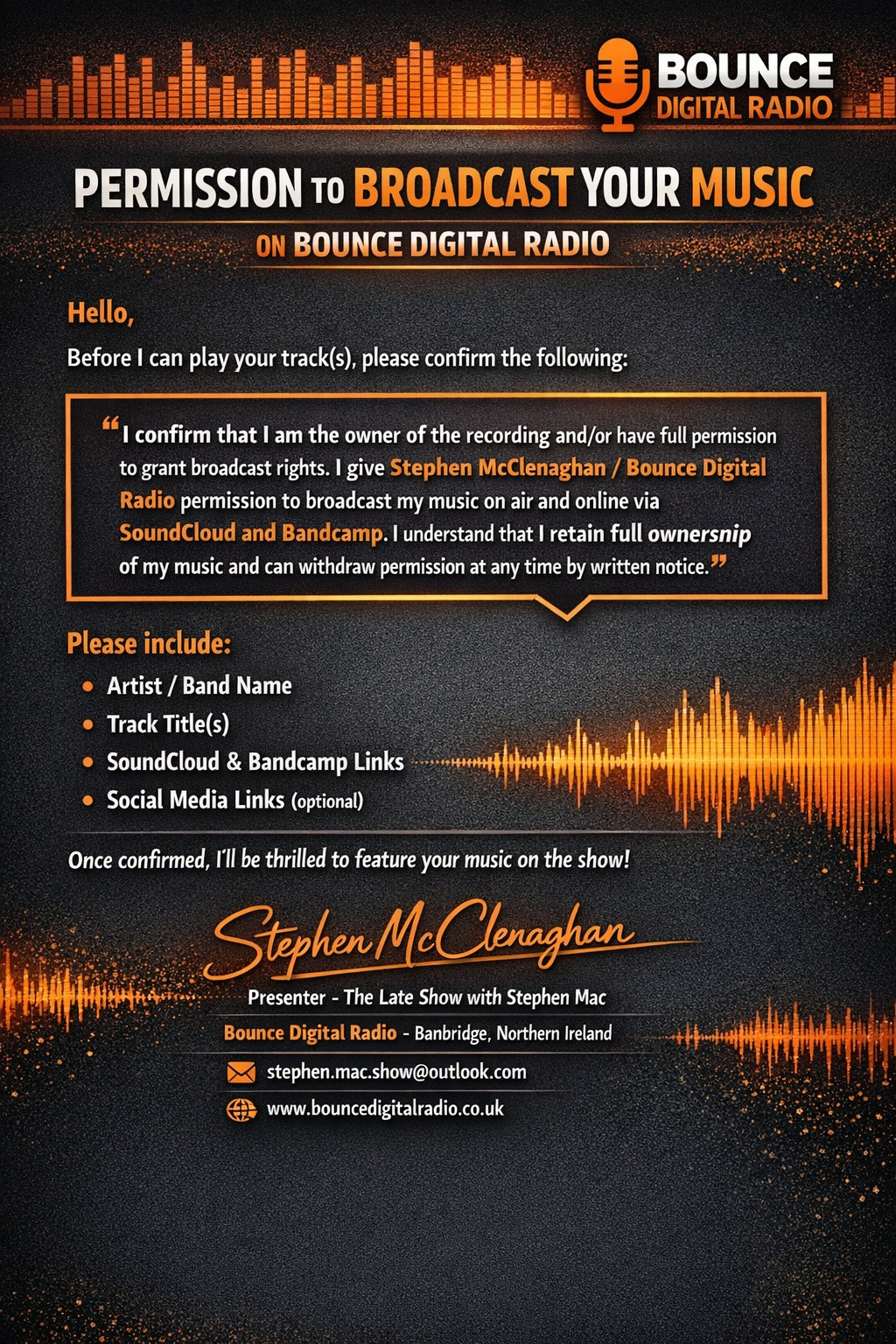 “I confirm that I am the owner of the recording and/or have full permission to grant broadcast rights. I give Stephen McClenaghan / Bounce Digital Radio permission to broadcast my music on air and online. I understand that I retain full ownership of my music and can withdraw permission at any time by written notice.”